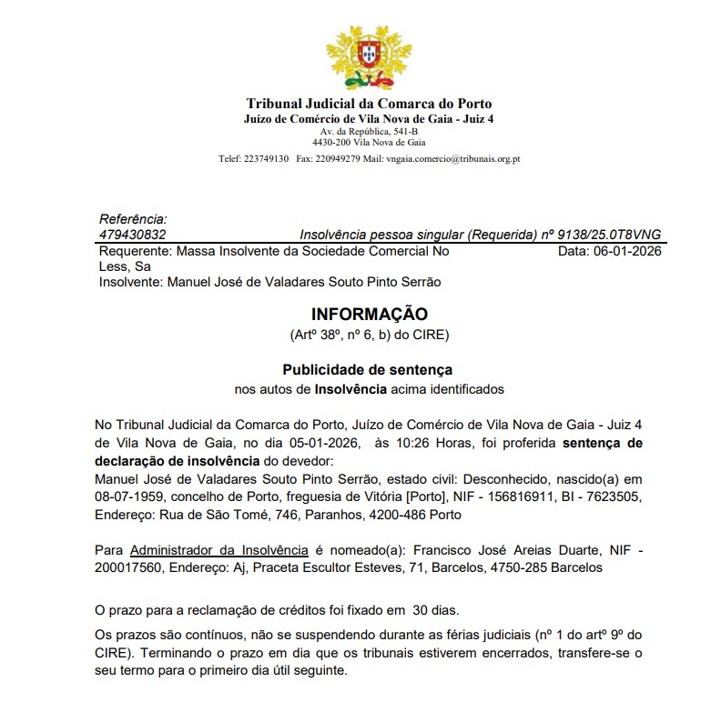 “No Tribunal Judicial da Comarca do Porto, Juízo de Comércio de Vila Nova de Gaia – Juiz 4 de Vila Nova de Gaia, no dia 05-01-2026, às 10h26 horas, foi proferida sentença de declaração de insolvência do devedor, Manuel José de Valadares Souto Pinto Serrão”, lê-se na sentença publicada no Citius e já divulgada pelo Jornal de Negócios.
