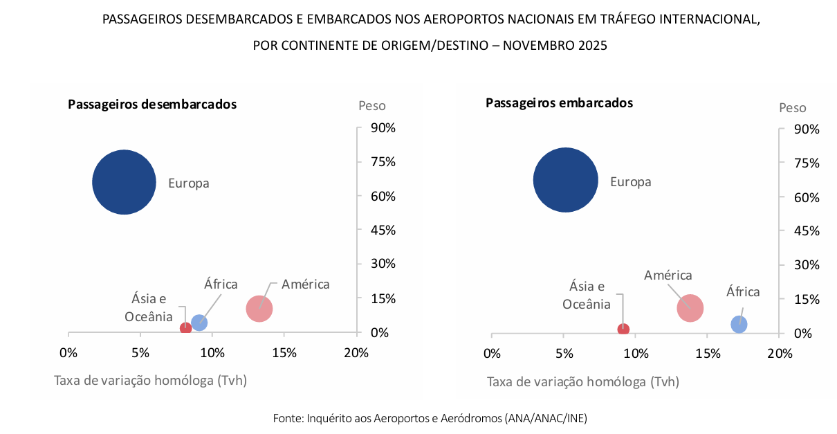 Em novembro de 2025, 82% dos passageiros desembarcados nos aeroportos nacionais corresponderam a tráfego internacional, num total de 1,9 milhões de passageiros, o que se traduz num aumento de 5,3% face ao período homólogo. “A maioria dos voos destes passageiros teve origem no continente europeu, que representou 66% do total, registando um crescimento de 3,8% face a novembro de 2024. O continente americano manteve-se como a segunda principal origem, concentrando 10,2% do total de passageiros desembarcados”, segundo o INE.