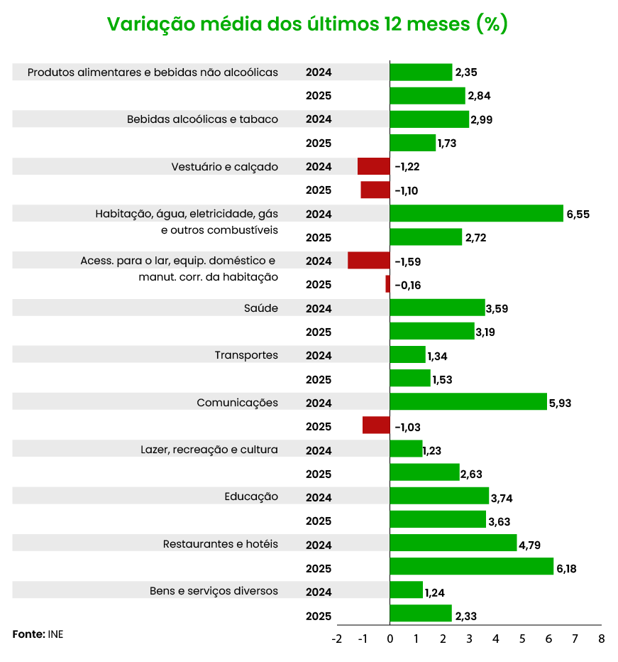 Em termos de contributo é certo que os produtos alimentares não transformados registaram o “mais significativo” para a taxa de variação média com uma variação de 4,8%, contra 1,6% no ano anterior. No entanto, quando a análise se centra apenas em que tipo de bens, verifica-se que os produtos alimentares e bebidas não alcoólicas mantém-se a tendência verificada no ano anterior, com uma variação média anual de 2,8%, contra 2,4% em 2024, depois dos picos dos anos anteriores.
