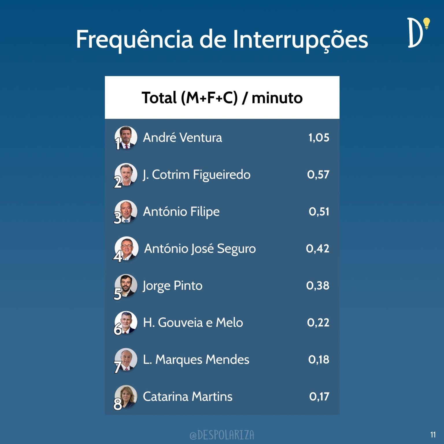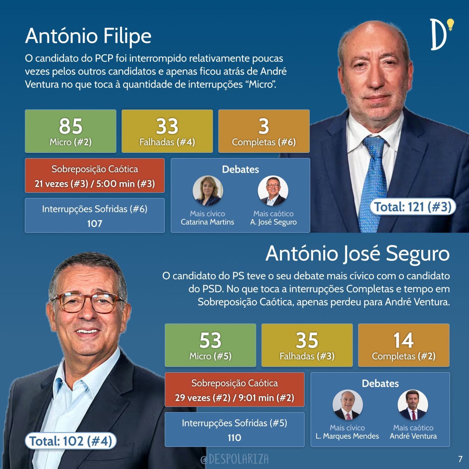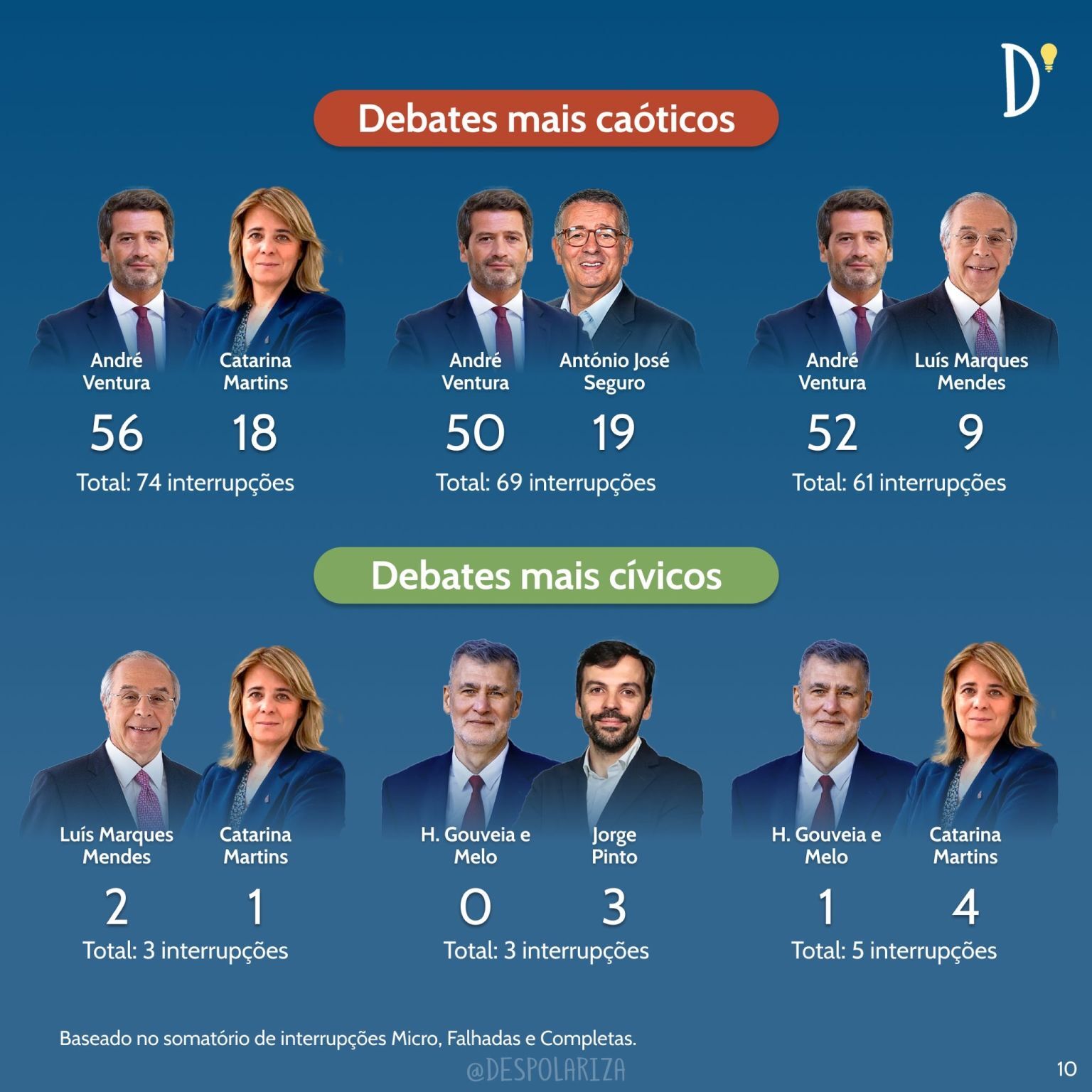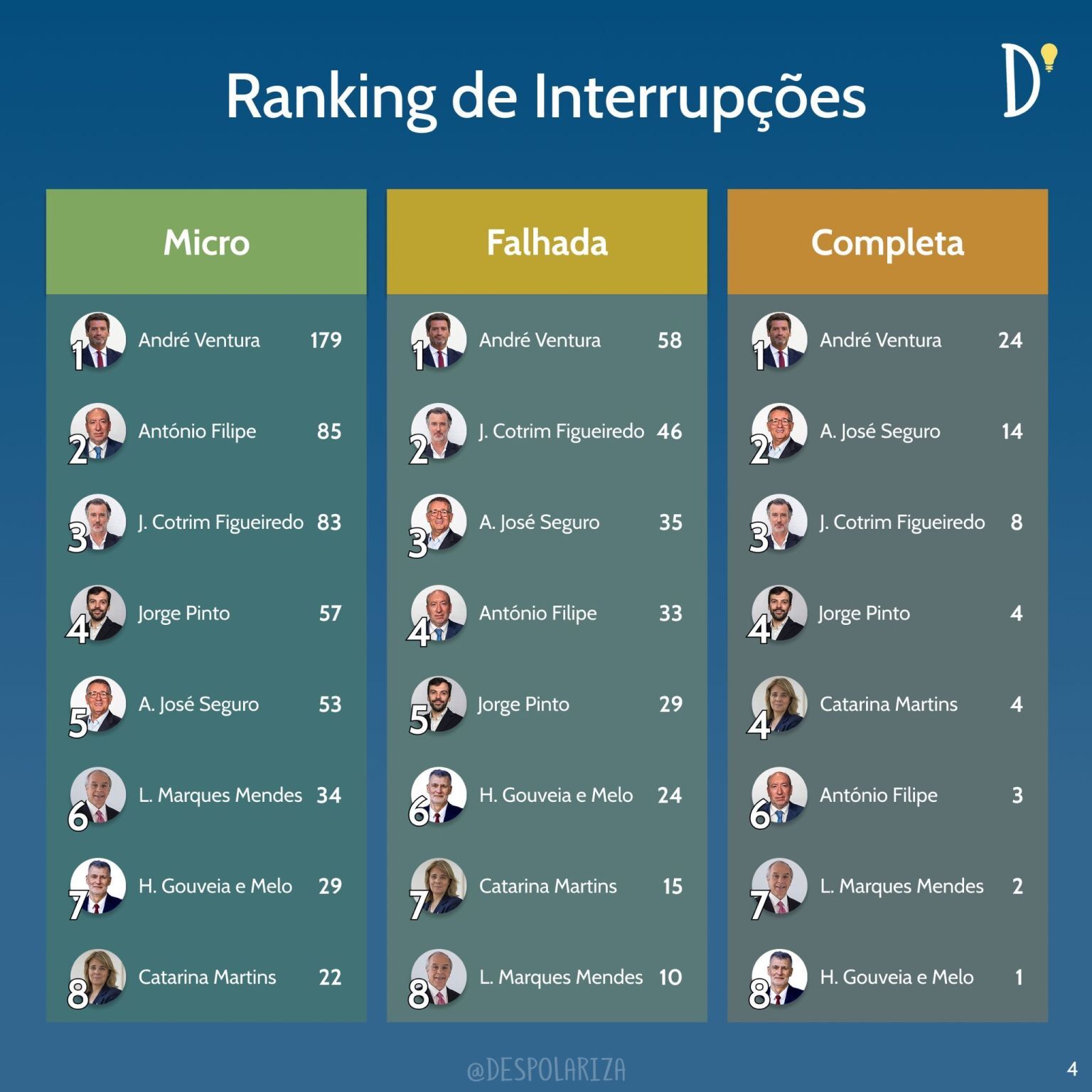 O líder do Chega lidera nos três tipos de interrupções, sendo nas micro seguido por António Filipe e João Cotrim de Figueiredo. Nas falhadas a segunda posição é ocupada pelo candidato apoiado pela IL e António José Seguro ocupa a terceira posição, sendo esta ordem trocada na interrupção completa.