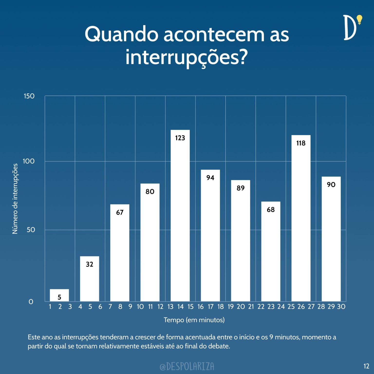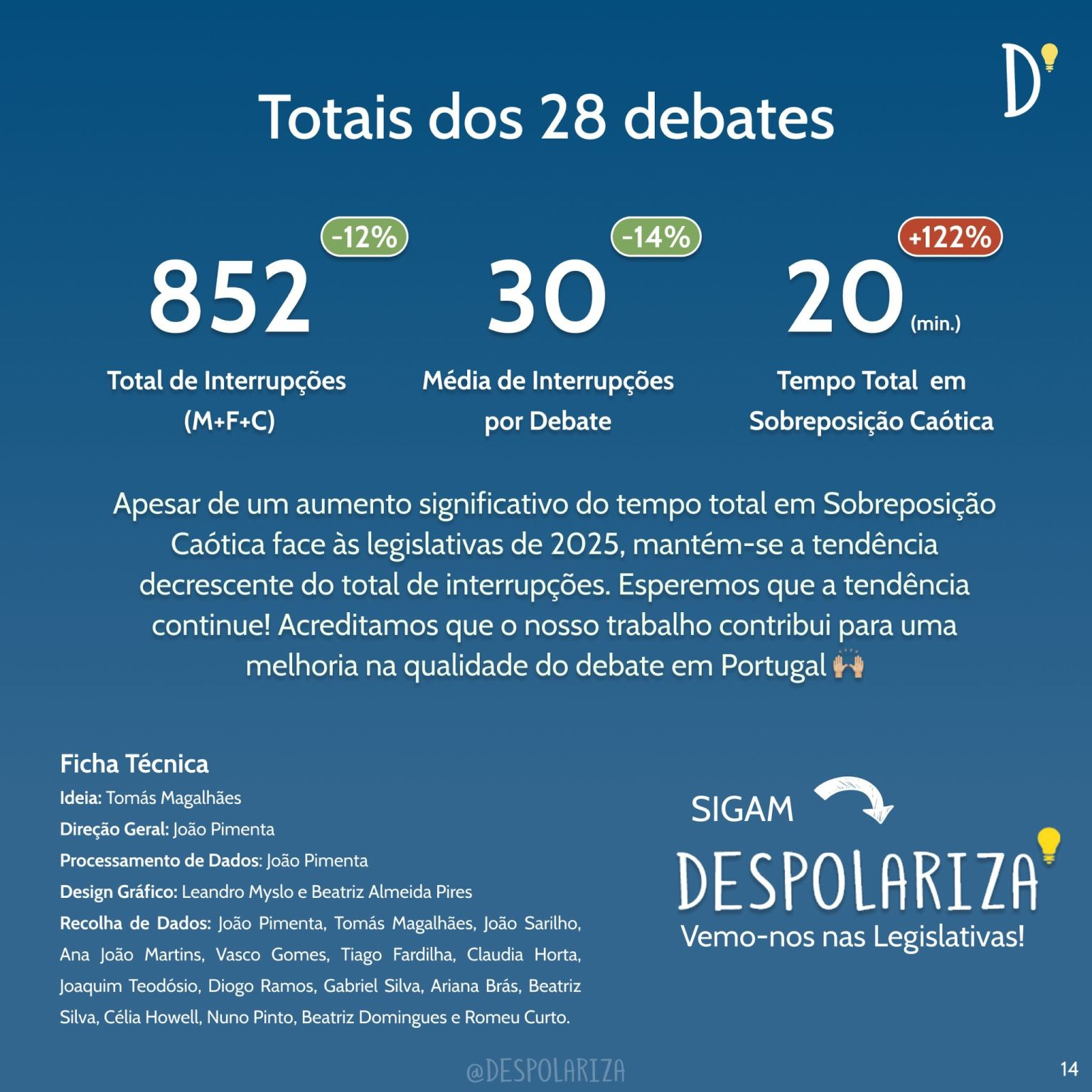 Apesar de terem existido um total de 852 interrupções, e comprando com as legislativas, a tendência é positiva. A sobreposição caótica aumentou 122%, mas o total de interrupções — 852 — diminuiu 12%. Em média existiram 30 interrupções por debate, menos 14%.