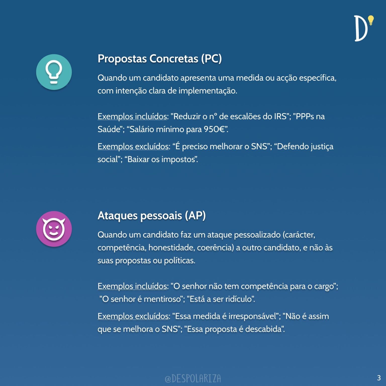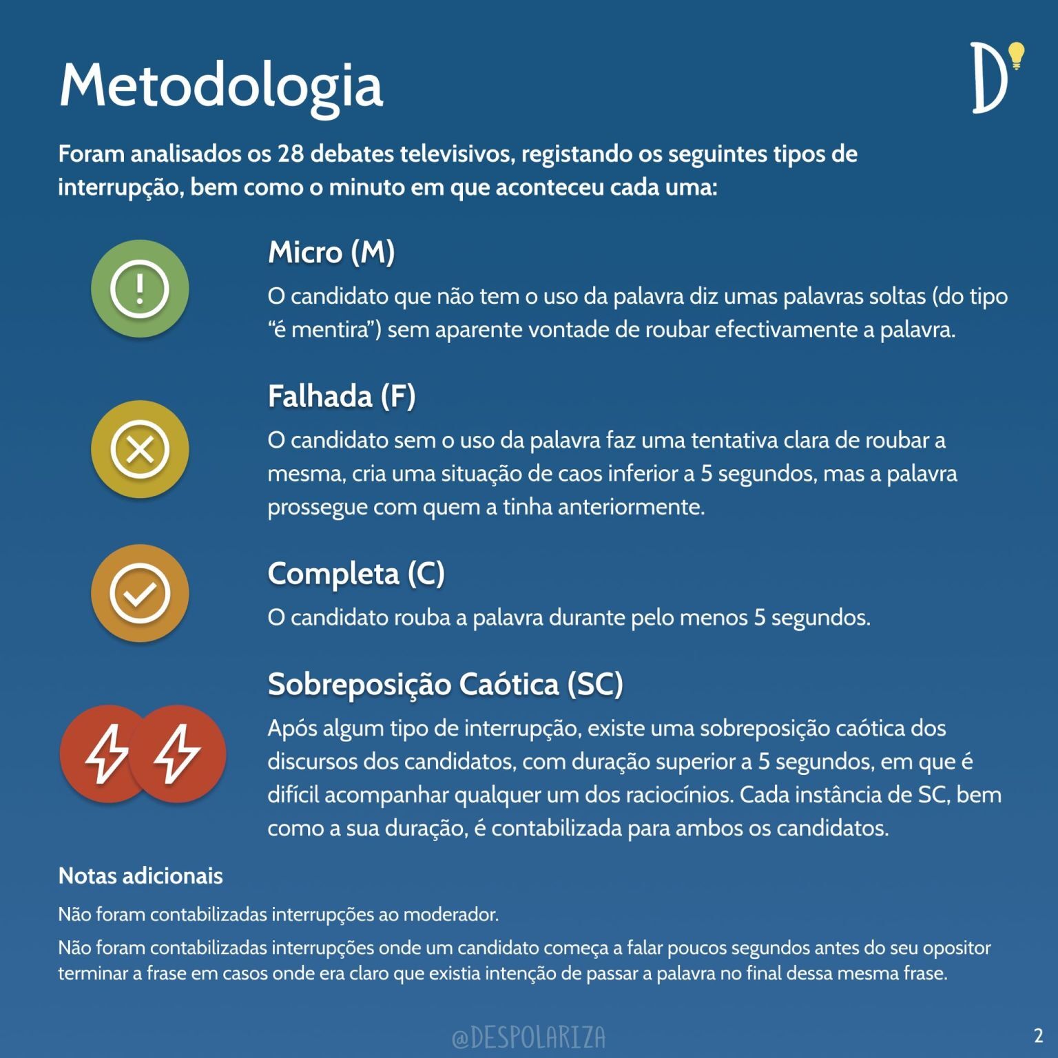 A análise foi dividida em três tipos de interrupção. A micro, em que quem não tem a palavra vai soltando palavras soltas por cima de quem está a falar, a falhada, quando o candidato que não tem a palavra tenta interromper e ficar com a palavra, não o conseguindo, e a completa, quando alguém que não está a falar tenta e consegue “roubar” a palavra. Há ainda a sobreposição caótica, que contabilizada quando após algum tipo de interrupção dois candidatos falam em simultâneo durante mais de cinco segundos, não se conseguindo perceber nenhum deles.