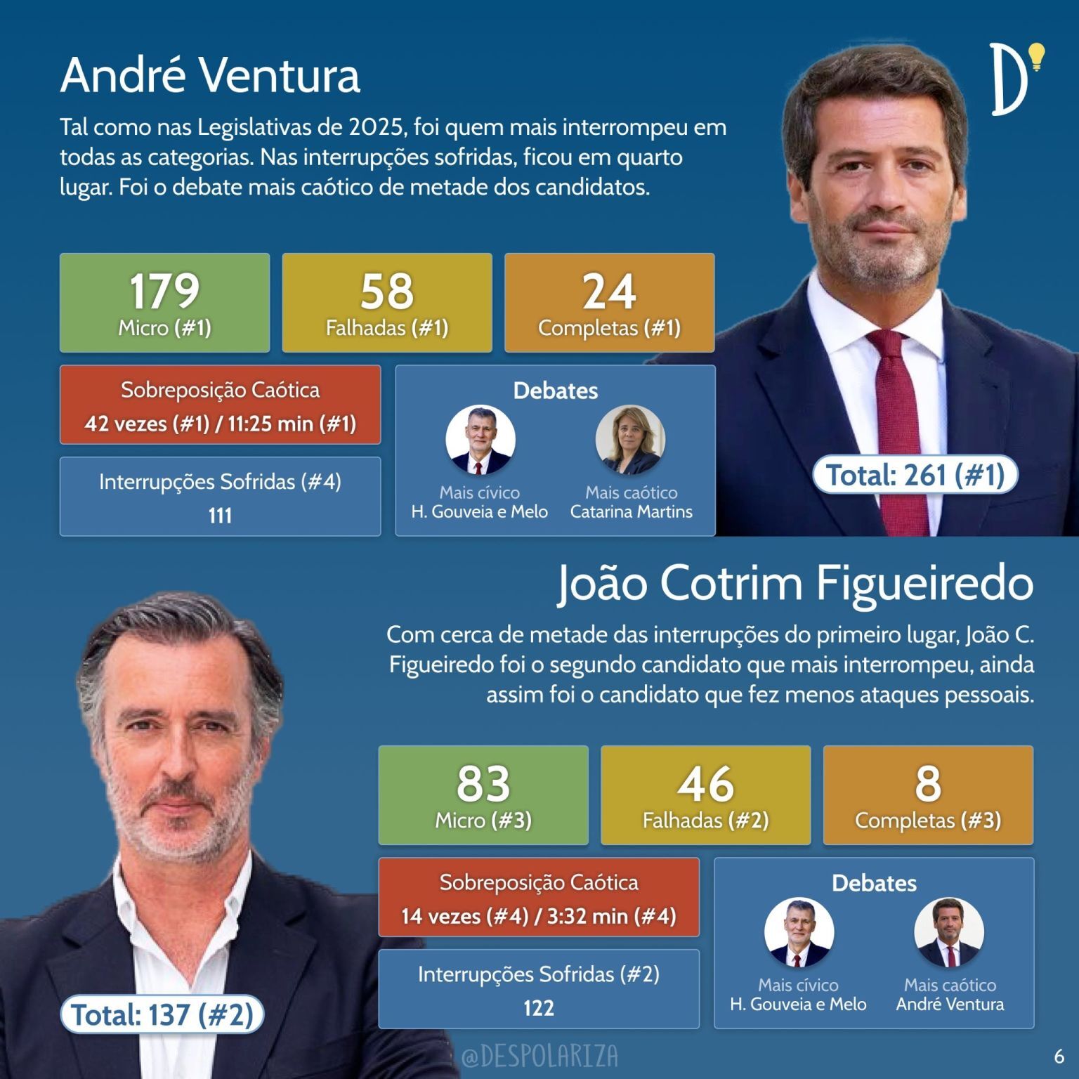 E o campeão das interrupções? Sem surpresa, até porque já foi assim em eleições anteriores, André Ventura ocupa a primeira posição deste ranking, com 261 interrupções. Seguem-se João Cotrim de Figueiredo, com 137 interrupções, e António Filipe, com 121.