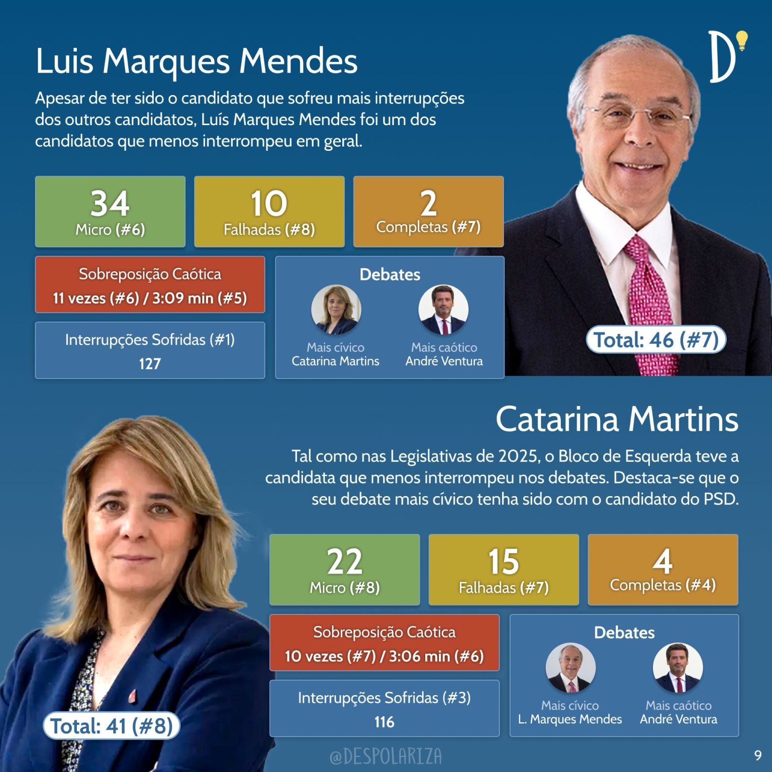 Os debates mais caóticos foram os protagonizados por André Ventura e Catarina Martins (74 interrupções), André Ventura e António José Seguro (69 interrupções) e André Ventura e Luís Marques Mendes (61 interrupções).