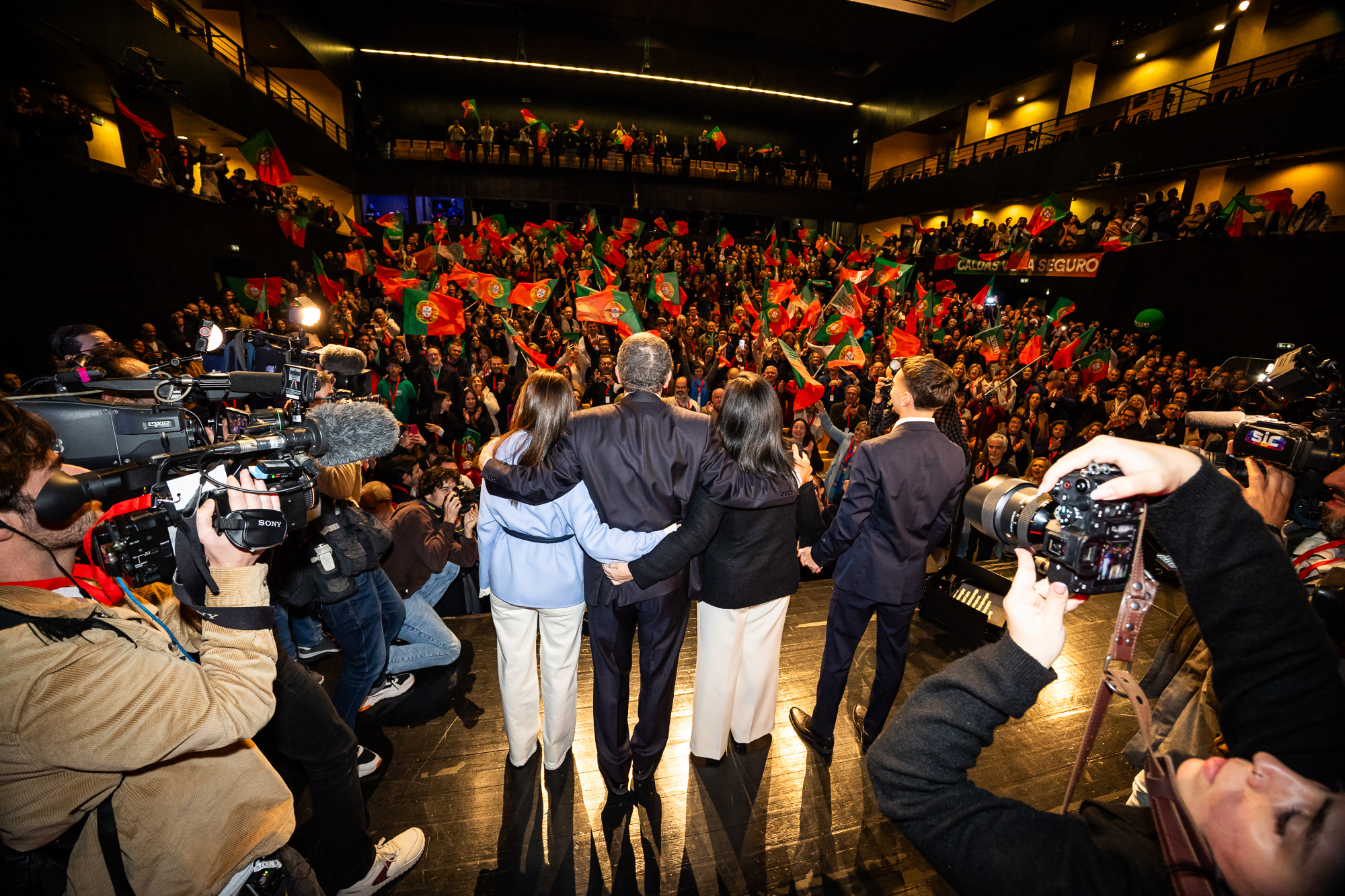 Divididos em duas alas do Centro Cultural caldense, os apoiantes começaram a fluir para o foyer a partir das 19h50. Em escassos cinco minutos, o espaço encheu-se de gente, uns com, outros sem bandeiras, mas todos sorridentes. Havia cerca de uma hora que circulava por ali a indicação de sondagens muito favoráveis.