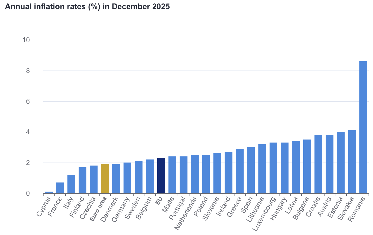 As taxas anuais mais baixas, medidas pelo Índice Harmonizado dos Preços no Consumidor (IHPC), foram registadas no Chipre (0,1%), em França (0,7%) e em Itália (1,2%), enquanto as taxas anuais mais elevadas foram registadas na Roménia (8,6%), Eslováquia (4,1%) e na Estónia (4,0%).