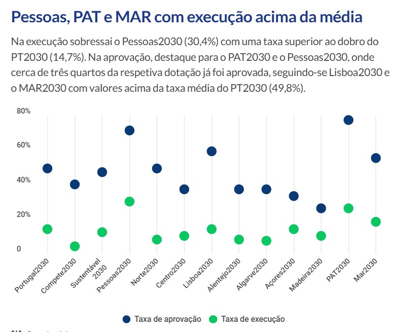 “Na execução destaca-se o Programa Pessoas 2030 (30,4%) com uma taxa superior ao dobro da taxa média do PT2030 (14,7%) e na aprovação o destaque vai para o Programa de Assistência Técnica PAT 2030, o Pessoas 2030, onde cerca de três quartos da respetiva dotação já foi aprovada, seguindo-se o Lisboa 2030 e o Mar 2030 com valores acima da taxa média do PT2030 (49,8%)”, destaca o boletim.