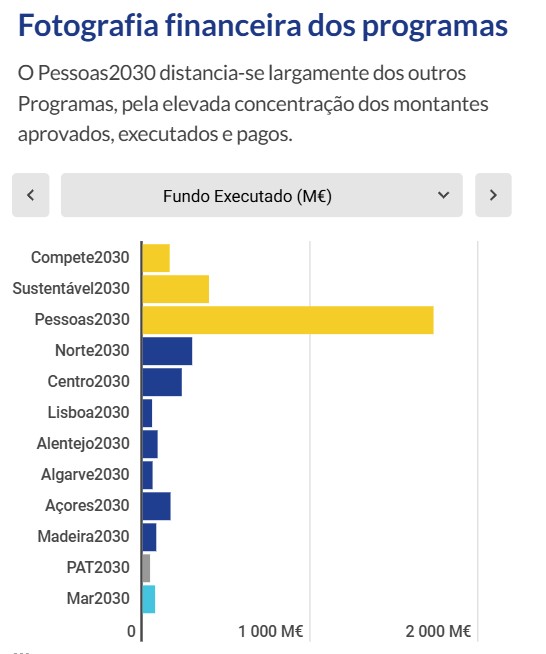 Entre os maiores programas em termos de dotação, o Sustentável 2030 tem uma taxa de execução de 12,7% e o Compete, também conhecido como o programa das empresas, continua no fundo da tabela com uma execução de 4,1%. No entanto, é o terceiro com maior volume de fundos aprovados (1,56 mil milhões), mas cai para último na execução, com 161,13 milhões de euros.