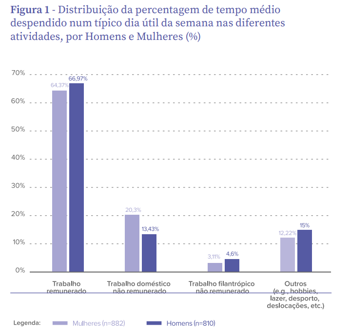 Em concreto, num dia útil típico, as mulheres despendem, em média, 64% do seu tempo em trabalho remunerado. Já os homens dedicam 67% do seu tempo.