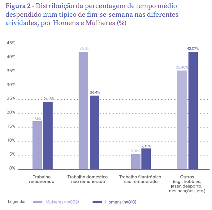 Já elas, no mesmo período, despendem a maior parte do dia em tarefas domésticas e outras atividades não remuneradas, também com uma média de cerca de 42%.
