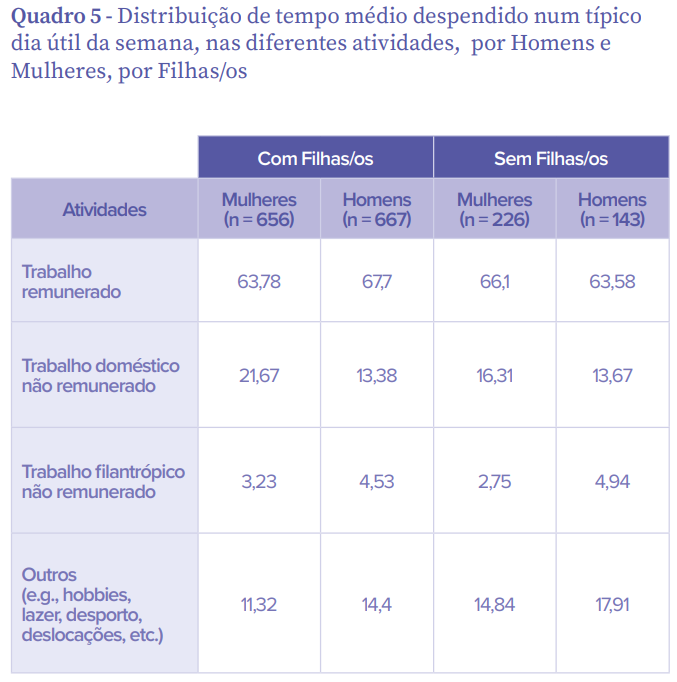 Mostra que, apesar dos “assinaláveis progressos registados ao nível da igualdade formal nas últimas décadas, subsistem desigualdades significativas na distribuição do tempo entre trabalho remunerado, trabalho doméstico não remunerado e lazer“.