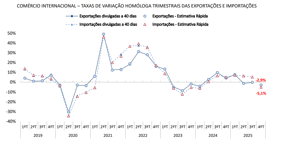 As exportações portuguesas deverão ter recuado 2,9% no quarto trimestre de 2025, em relação ao período homólogo, segundo uma estimativa rápida divulgada esta quarta-feira pelo Instituto Nacional de Estatística. As importações também mostraram uma evolução negativa, com a estimativa rápida a apontar para uma quebra de 5,1% em termos nominais e homólogos. Depois de um ano negativo, as empresas apresentam previsões positivas para 2026.