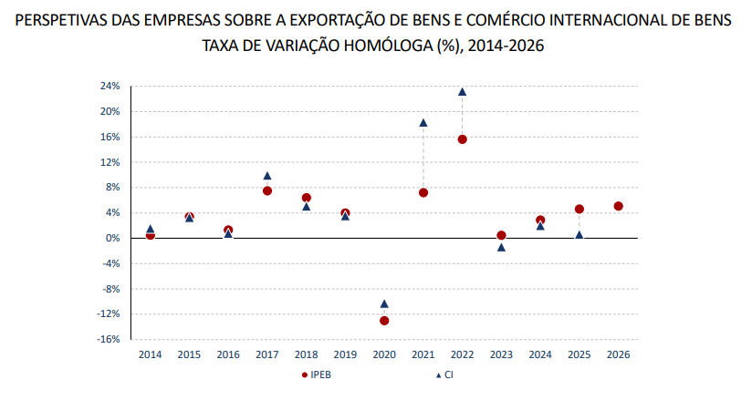 As empresas de média dimensão, que representam 26% do valor previsto das exportações para 2026, apresentam a expectativa de crescimento mais expressiva, antecipando um aumento das vendas ao exterior de 10,6%.