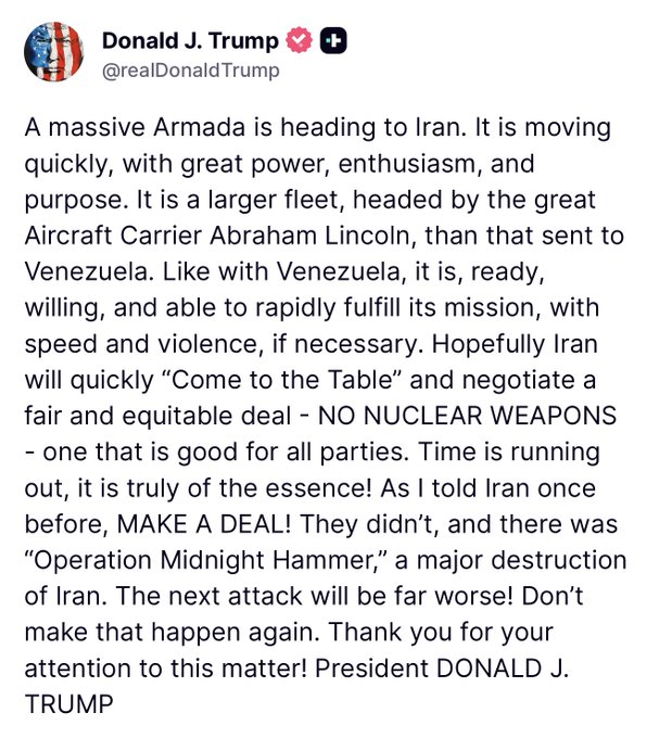 Referindo-se à “enorme armada”, Trump afirmou que esta frota é “maior (…) do que a enviada para a Venezuela”, indicando a prontidão dos Estados Unidos para cumprir rapidamente a sua missão, “rapidamente e de forma violenta, se necessário”. As tensões entre os dois países estão no seu ponto mais alto desde a repressão aos protestos antigovernamentais no Irão no início deste ano, que motivou críticas internacionais e preocupações sobre a estabilidade regional.