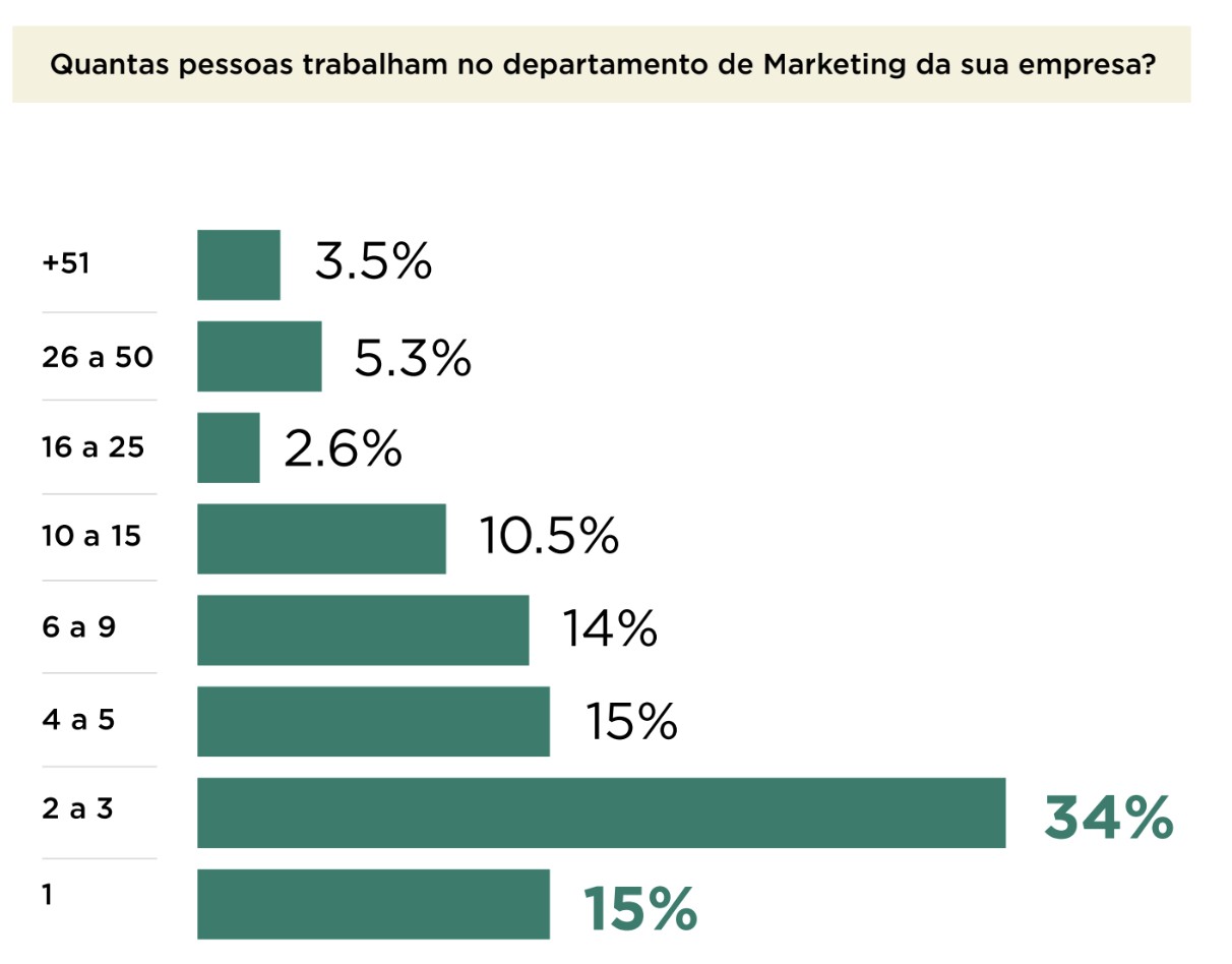 O estudo aponta ainda que a maioria dos departamentos de marketing em Portugal opera com equipas de dimensão reduzida. Cerca de metade tem menos de cinco profissionais dedicados e em 15% dos casos existe apenas uma pessoa responsável pelo marketing de toda a organização. Mesmo nas grandes empresas e nas grandes multinacionais, as equipas reduzidas desempenham um papel. Quase 40% das grandes empresas operam com equipas de até cinco pessoas.