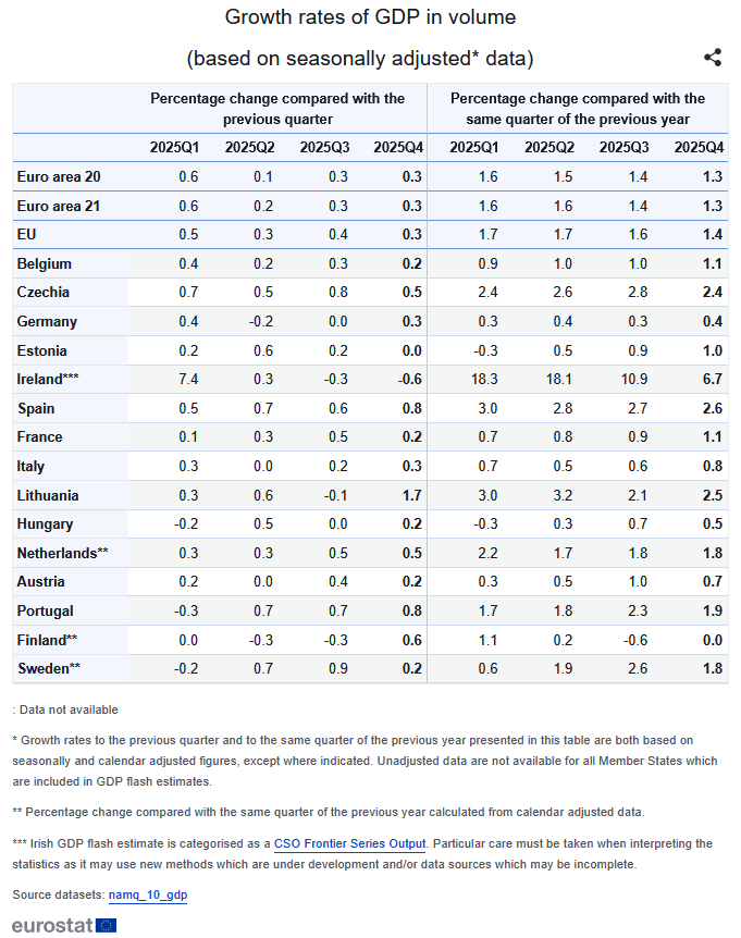 Porém, a estrela do crescimento europeu em 2025 foi a Irlanda, que apesar de ter entrado em recessão técnica no final de 2025, com o PIB a contrair 0,6% no quarto trimestre face ao trimestre anterior — a segunda contração consecutiva após os -0,3% do terceiro trimestre –, fechou o ano com um crescimento de 12,6%.