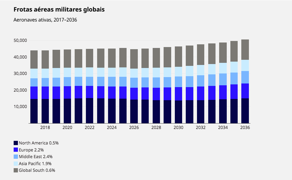 Estima-se que a frota militar mundial cresça de 45.000 aeronaves para 51.000 até 2036. Europa deverá receber mais de 110 mil milhões de dólares em novas aeronaves até 2032, estima a Oliver Wyman.