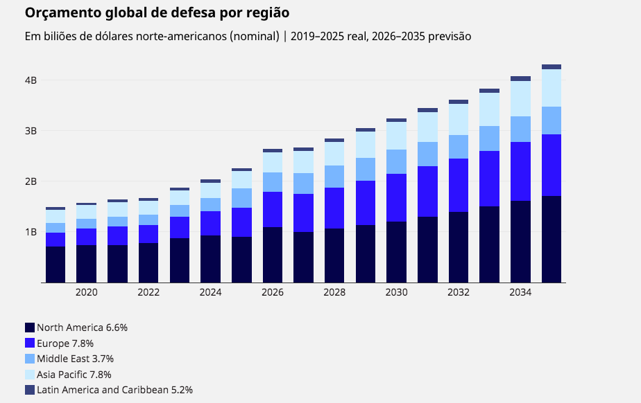 Globalmente, os gastos de defesa deverão subir 6,7% até 2035, mas na Europa deverá ter um aumento orçamental anual médio estimado de 7,8%, passando de cerca de 571 mil milhões para 1,2 biliões de dólares. “Este aumento reflete-se tanto na disponibilidade como na utilização das frotas a partir de 2022, o que aumenta a pressão sobre a manutenção”, refere a consultora.