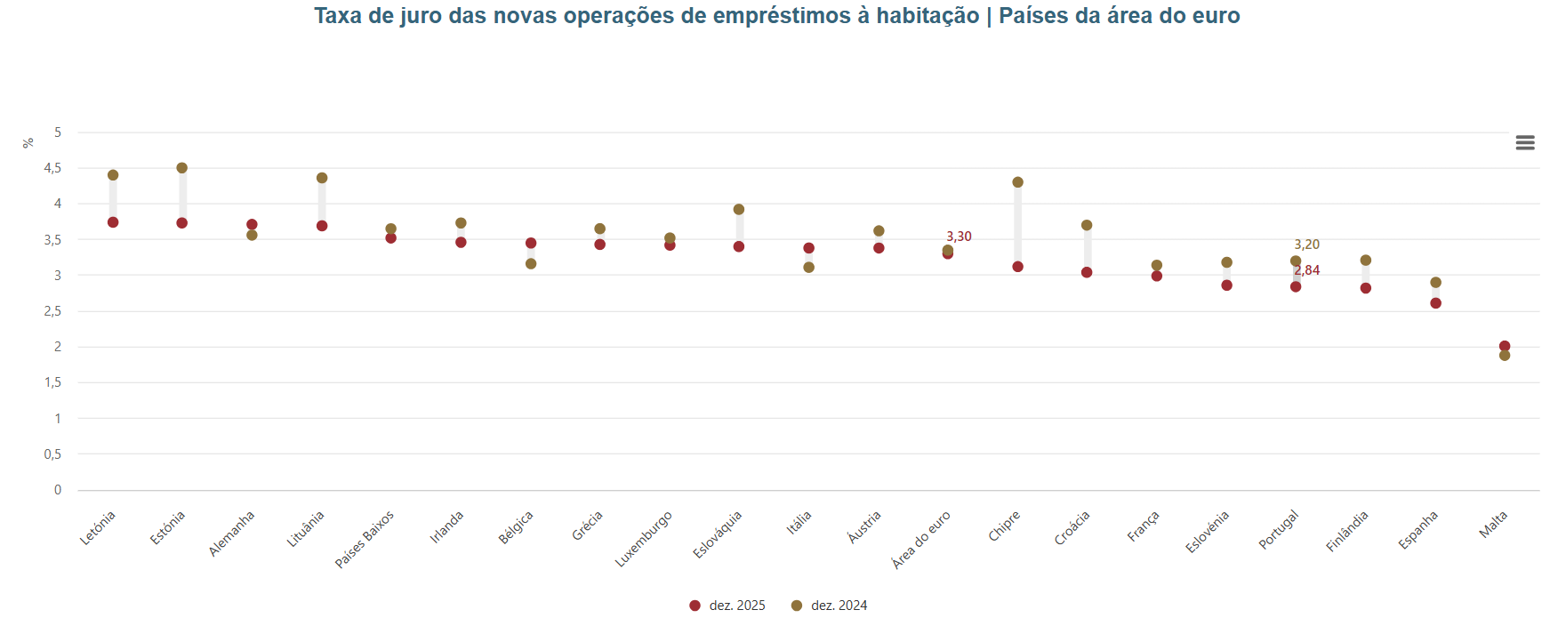 Em comparação com a Zona Euro, a taxa de juro média em Portugal situa-se abaixo da média, sendo a quarta menor, quando em dezembro de 2024 estava no sétimo lugar. A taxa de juro média das novas operações de empréstimos à habitação do conjunto dos países do euro diminuiu 0,05 pp., fixando-se em 3,30% no final de 2025.