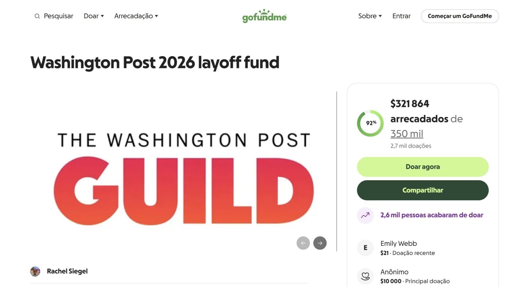 “Este tem sido um dia incrivelmente difícil no The Post e, na maior parte das vezes, faltam-nos as palavras. No entanto, estamos profundamente sensibilizados com a vaga de apoio que temos recebido. Grande parte destes acontecimentos — a perda dos nossos colegas e as decisões tomadas por esta empresa — parece escapar ao nosso controlo e ultrapassa largamente o cenário para o qual julgávamos estar preparados. A necessidade é, também ela, sem precedentes, e a escala da situação é difícil de mensurar” escreveu, numa mensagem da página, Rachel Siegel, jornalista do The Washington Post e organizadora da angariação, em conjunto com o sindicato da redação.