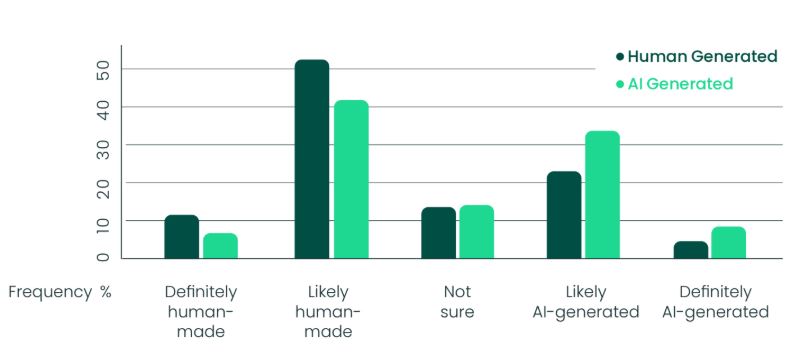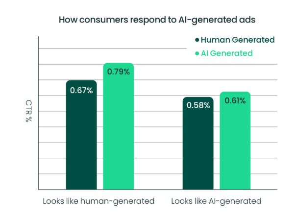 Os investigadores, num estudo de perceção em separado, pediram a participantes para identificarem quem foi o autor dos anúncios. Os resultados mostraram que quase metade dos criados por IA foram percecionados como tendo mão humana. Os consumidores também tiveram dificuldade em separar corretamente o verdadeiro autor.