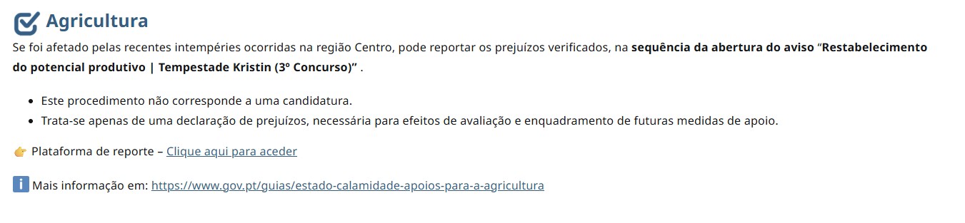 No capítulo das ajudas, a CNA pediu um esclarecimento ao Ministério da Agricultura, porque ao tentar preencher o formulário para a medida simplificada para os prejuízos causados na agricultura pela depressão Kristin e fenómenos climatéricos subsequentes, os agricultores são informados que o “procedimento não corresponde a uma candidatura”, tratando-se apenas de uma declaração de prejuízos.