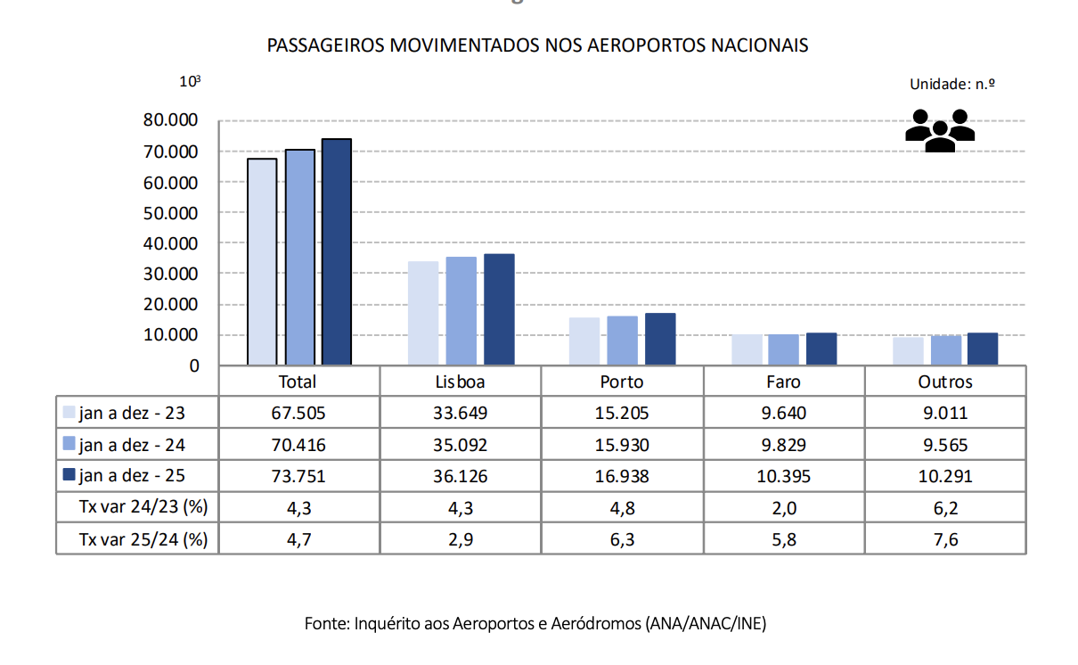 Passaram 73,75 milhões de passageiros pelos aeroportos nacionais em 2025, mais 4,7% que no ano anterior, fixando um novo recorde. Uma tendência que não foi acompanhada pela carga e correio, onde se registou uma quebra de 0,5%.