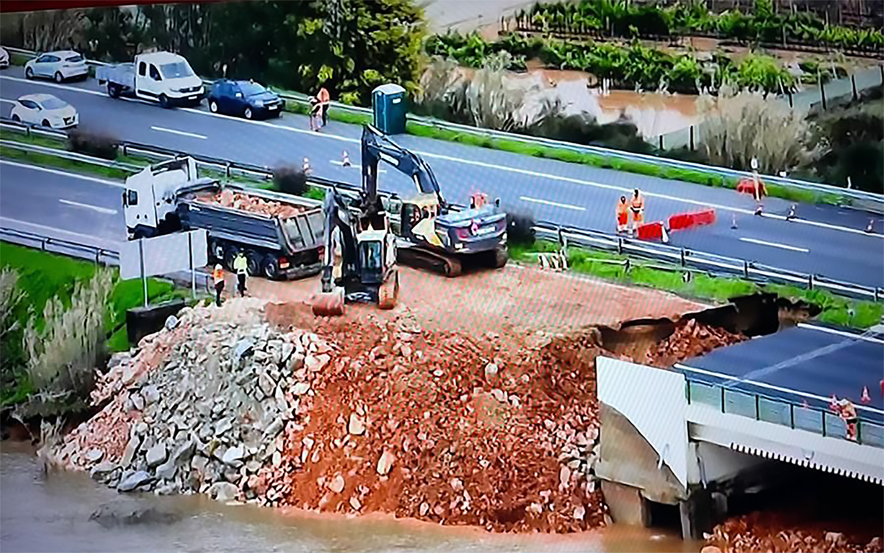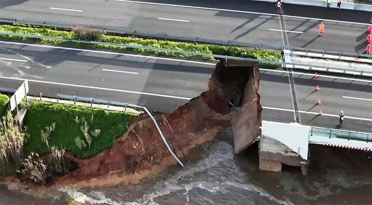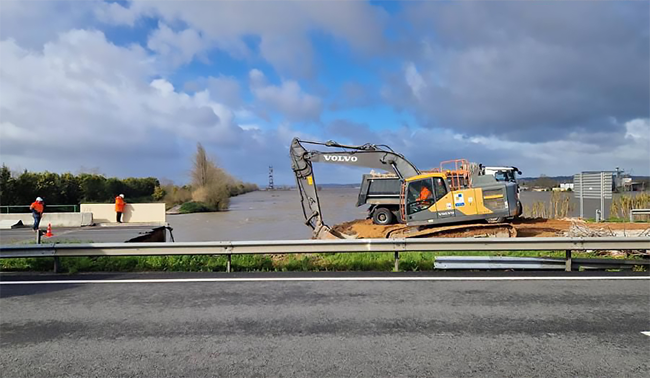 O colapso de um dique no Mondego, devido às cheias, levou à queda de uma parte da autoestrada A1 no quilómetro 191. A Brisa já avançou com obras de estabilização, para evitar que haja mais danos nas duas faixas de rodagem.