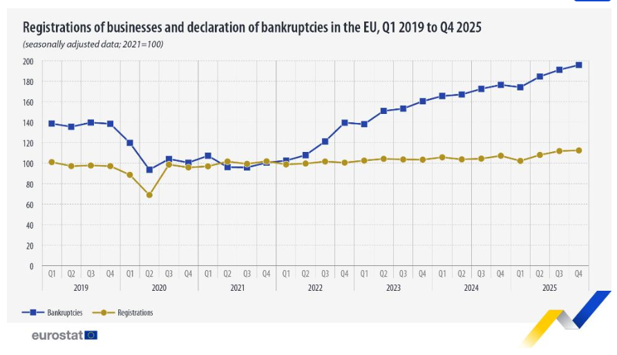 Falências de empresas na UE sobem 2,5%, mas registos aumenta 0,5% no quarto trimestre