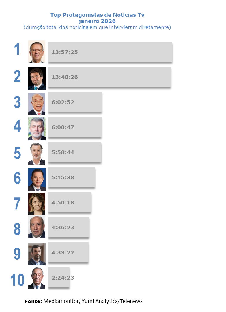O agora eleito Presidente da República, António José Seguro, subiu à primeira posição na exposição mediática, ao protagonizar 232 notícias de 13 horas e 57 minutos de duração durante o mês de janeiro. Esse mês foi marcado pela primeira volta das eleições presidenciais, no dia 18 de janeiro.