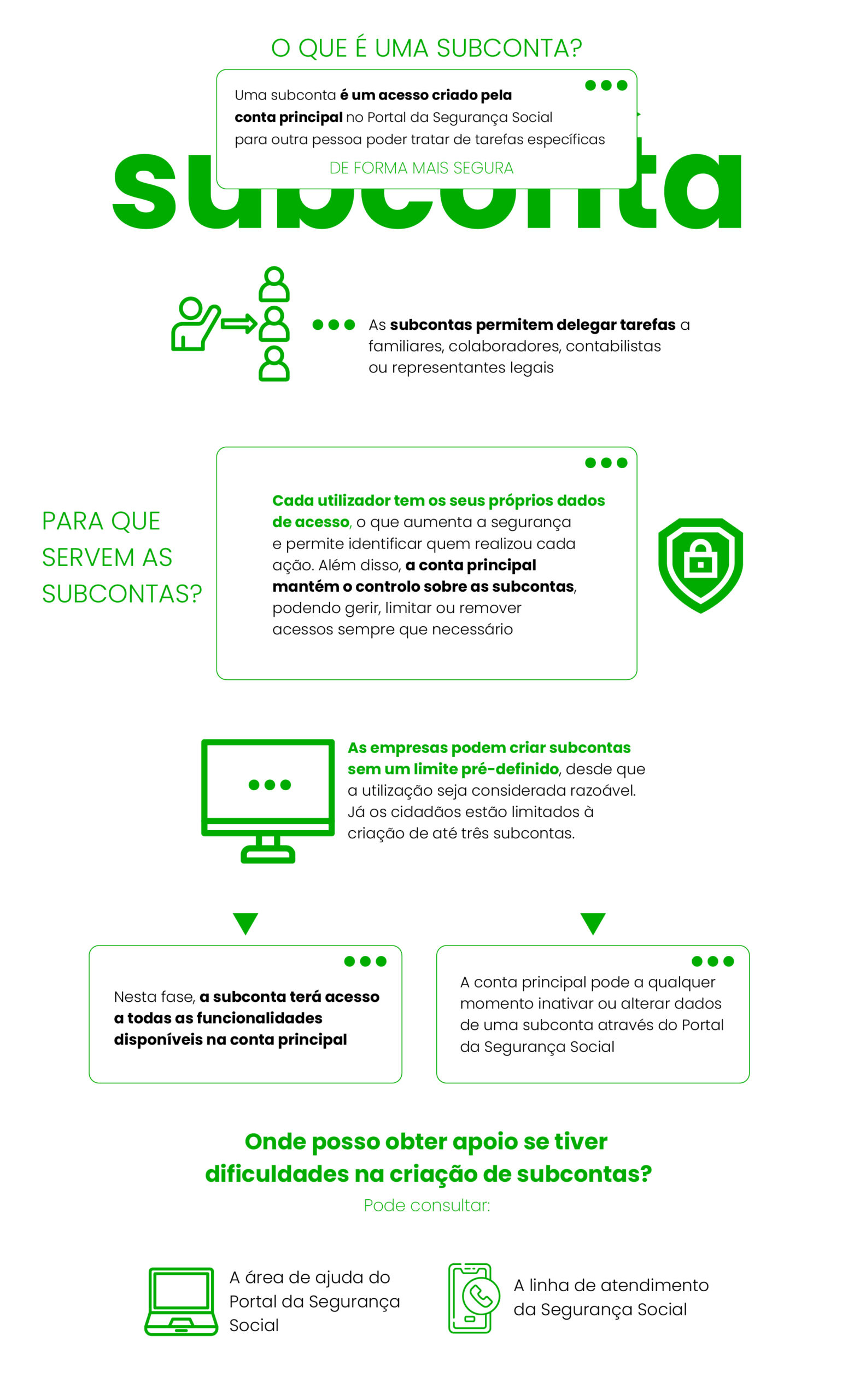 A Segurança Social disponibilizou uma nova funcionalidade no seu Portal que permite a criação de subcontas de acesso, tanto por cidadãos como por empresas. Até agora, a interação era feita através do Número de Identificação da Segurança Social (NISS) da entidade e de uma única palavra-passe, partilhada por quem necessitasse de aceder às funcionalidades disponíveis.