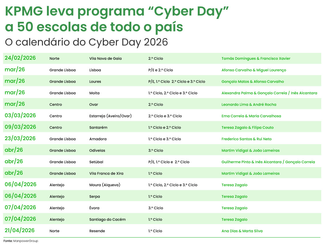 A KPMG Portugal está a levar a cabo a maior edição de sempre do programa Cyber Day, um projeto nacional de formação em literacia digital e cibersegurança dirigido a crianças e a jovens dos seis aos 16 anos. Até ao início do próximo verão, as equipas da consultora vão visitar mais de uma dezena de escolas para explicar fundamentos da segurança digital, explorar conceitos relacionados com a inteligência artificial e deepfakes, e aprender a identificar os vários tipos de ciberataques e estratégias de prevenção.