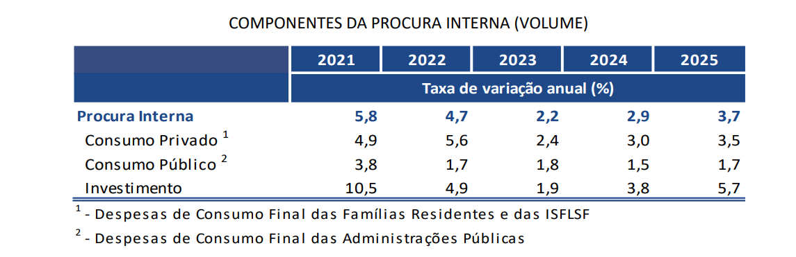 Para este ano, o Ministério das Finanças prevê um crescimento de 2,3%, em linha com o esperado pelo Banco de Portugal e acima das projeções das restantes principais instituições económicas. Porém, o Governo já alertou que as intempéries que fustigaram o país terão consequências na economia e nas contas públicas, deixando em aberto a possibilidade de alteração do cenário macroeconómico.
