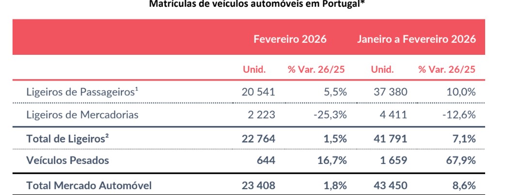 No que respeita aos ligeiros de passageiros, no segundo mês do ano foram matriculados em Portugal 20.541 automóveis, o que representa um crescimento de 5,5% face ao fevereiro de 2025. Nos veículos pesados as vendas aumentaram 16,7%, para 644 viaturas.