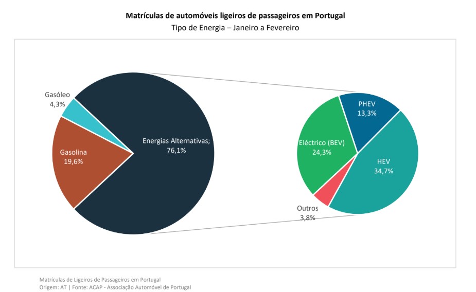 De janeiro a fevereiro deste ano, 76,1% dos veículos ligeiros de passageiros matriculados novos eram movidos a energias alternativas, sendo de destacar os elétricos e híbridos. Os dados mostram que nos dois primeiros meses do ano 24,3% dos veículos ligeiros de passageiros novos eram elétricos.