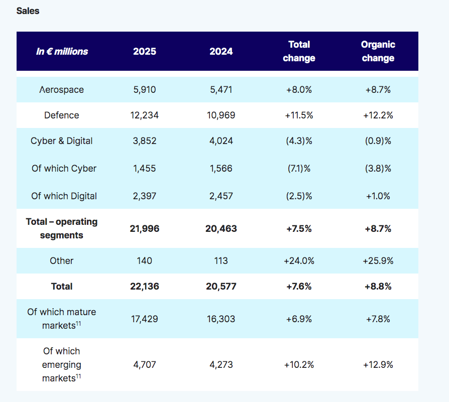No segmento aeroespacial, as vendas totalizaram 5.910 milhões de euros, uma subida de 8% face a 2024 (+8,7% a taxas de câmbio e escopo constantes). “Esse sólido progresso reflete, em particular, o crescimento orgânico de dois dígitos do negócio de aviação em 2025, com forte impulso em todas as atividades, tanto no setor civil quanto no militar”, aponta a empresa.
