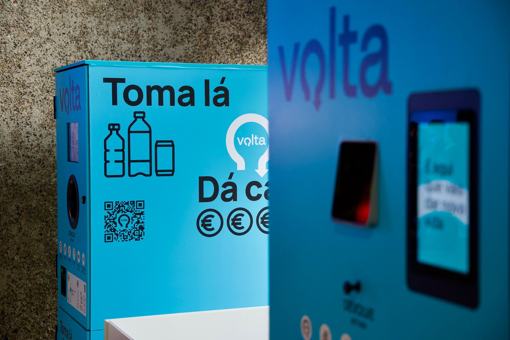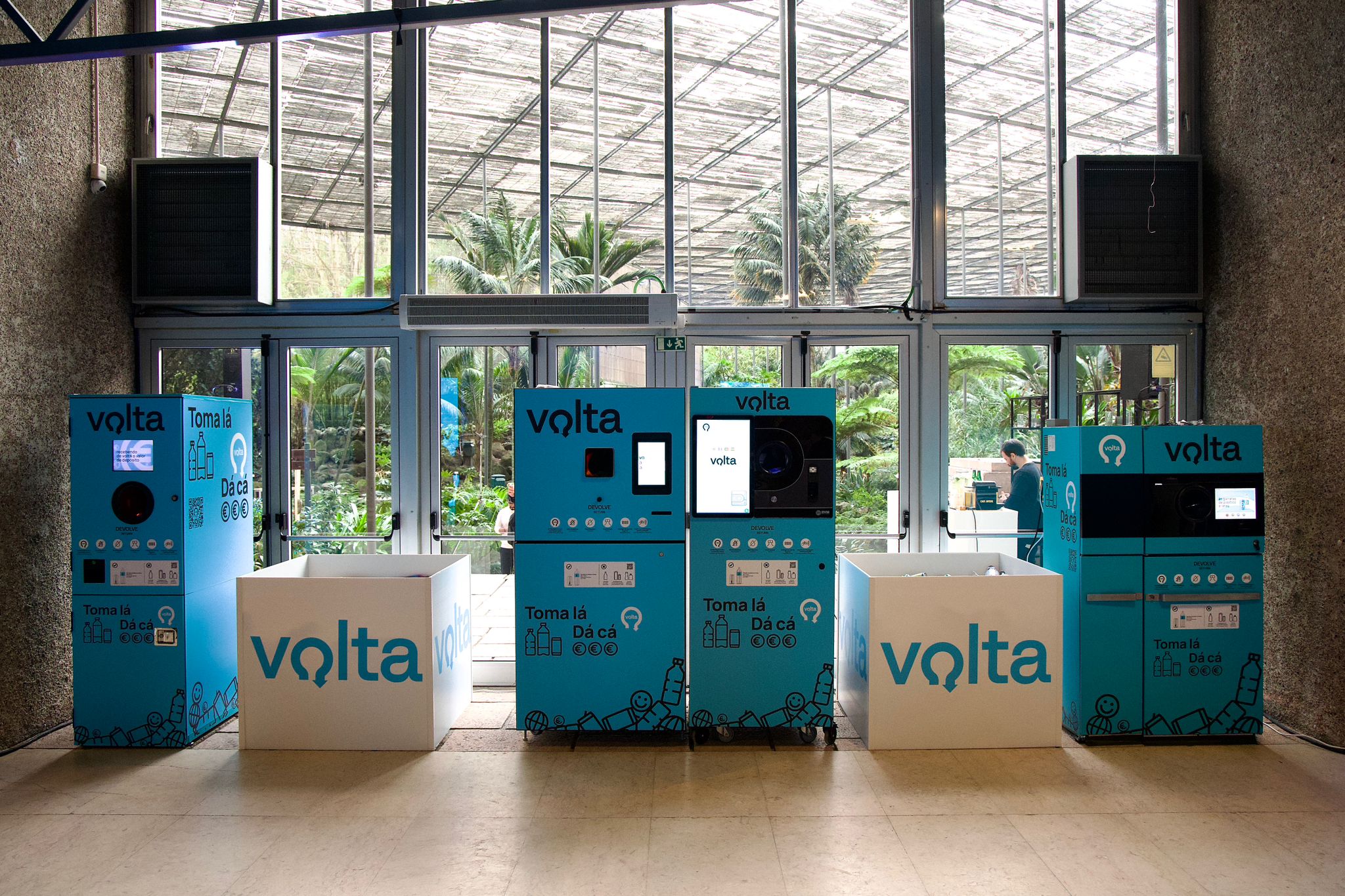 Volta é o nome da marca, azul é a cor predominante, “toma lá, dá cá” é a frase que se lê nas máquinas e apela à ação. Esta quarta-feira, na Estufa Fria, no evento de apresentação, estiveram disponíveis quatro máquinas que servem de ilustração ao que o consumidor poderá encontrar nos supermercados.