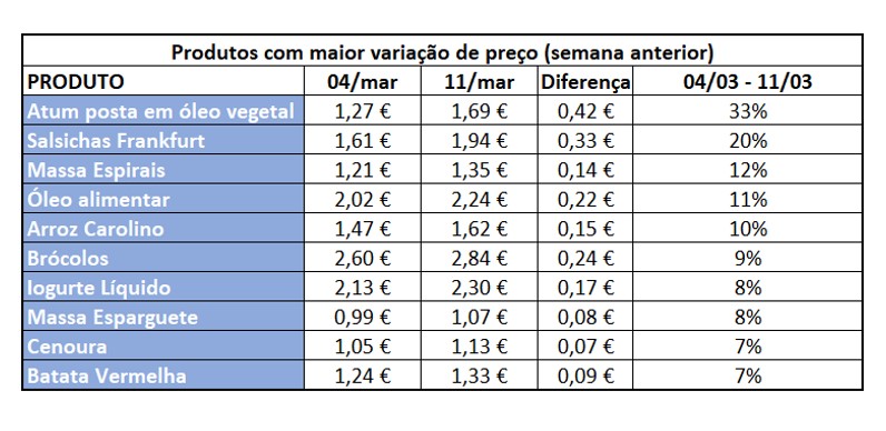 Entre os produtos cujo preço mais aumentou percentualmente na última semana, entre 4 e 11 de março, destacam-se a atum posta em óleo vegetal (33% para 1,69 euros o quilo), as salsichas de Frankfurt (20% para 1,94 euros) e a massa espirais (12% para 1,35 euros). Comparando com o início do ano, a curgete aumentou 38%, a dourada 28% e a couve-coração 27%.