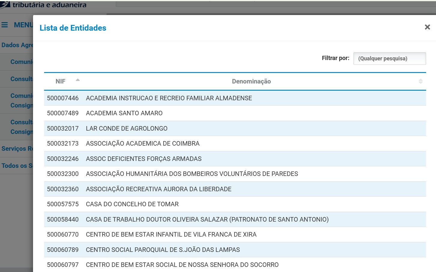 A AT disponibiliza previamente ao prazo de entrega da declaração de rendimentos (ou do IRS Automático) uma lista com as entidades relativamente às quais pode vir a fazer a consignação em sede de IRS/IVA.