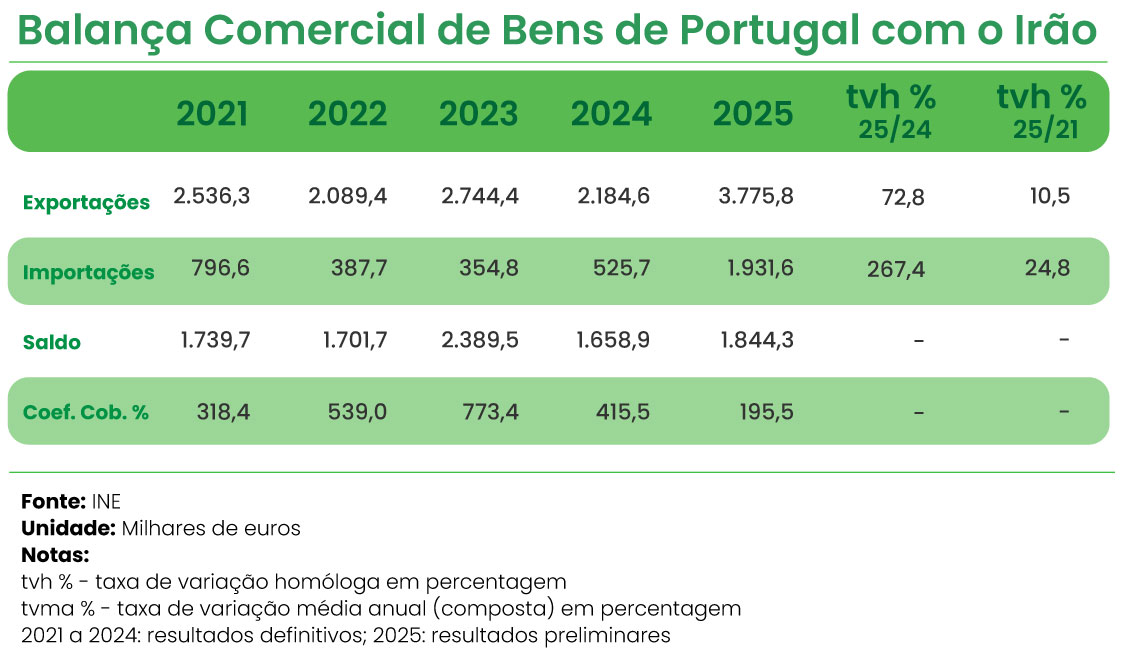 De acordo com dados do Instituto Nacional de Estatística (INE), as importações portuguesas do Irão ascenderam a 527,7 milhões de euros em 2024, tendo aumento 267,4% em 2025, para 1.931,6 milhões de euros. Portugal não depende pois de importações diretas iranianas, ao contrário de alguns países asiáticos, o que reduz o impacto direto.