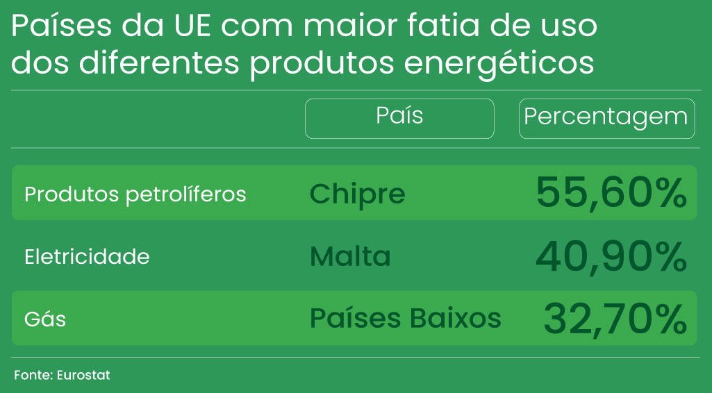 Este uso ocupa uma fatia de 12%. Chipre é o país da União Europeia que consome a maior fatia de produtos petrolíferos, acima de 55%, Malta é o ‘recordista’ na eletricidade, chegando aos 40,9%, e os Países Baixos exibem a maior percentagem de uso de gás, atingindo os 32,7%.