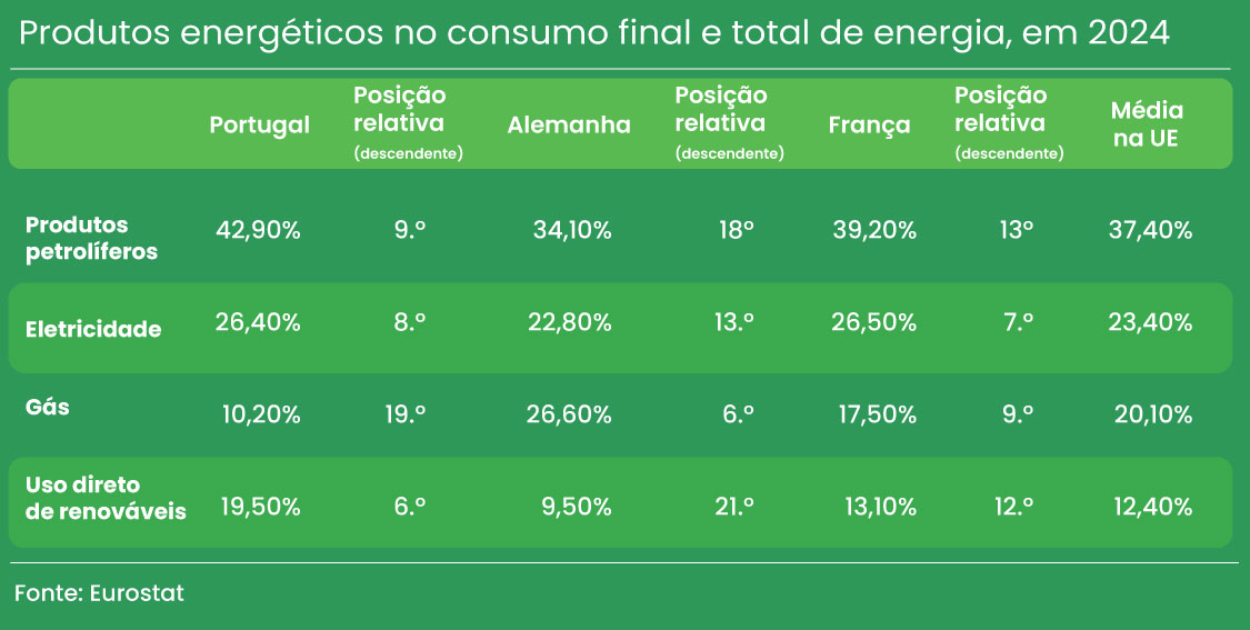 Portugal está acima da média europeia no uso de produtos petrolíferos e de eletricidade, mas bastante abaixo no uso de gás natural. Já em comparação com os dois motores económicos da Europa, Alemanha e França, consome mais produtos petrolíferos, enquanto na eletricidade ultrapassa a Alemanha mas está ligeiramente abaixo de França, quase taco a taco. Já em relação ao gás, é o nono país que menos o usa, sendo portanto menos dependente deste gás fóssil que o geral da Europa, e que França e Alemanha em particular.