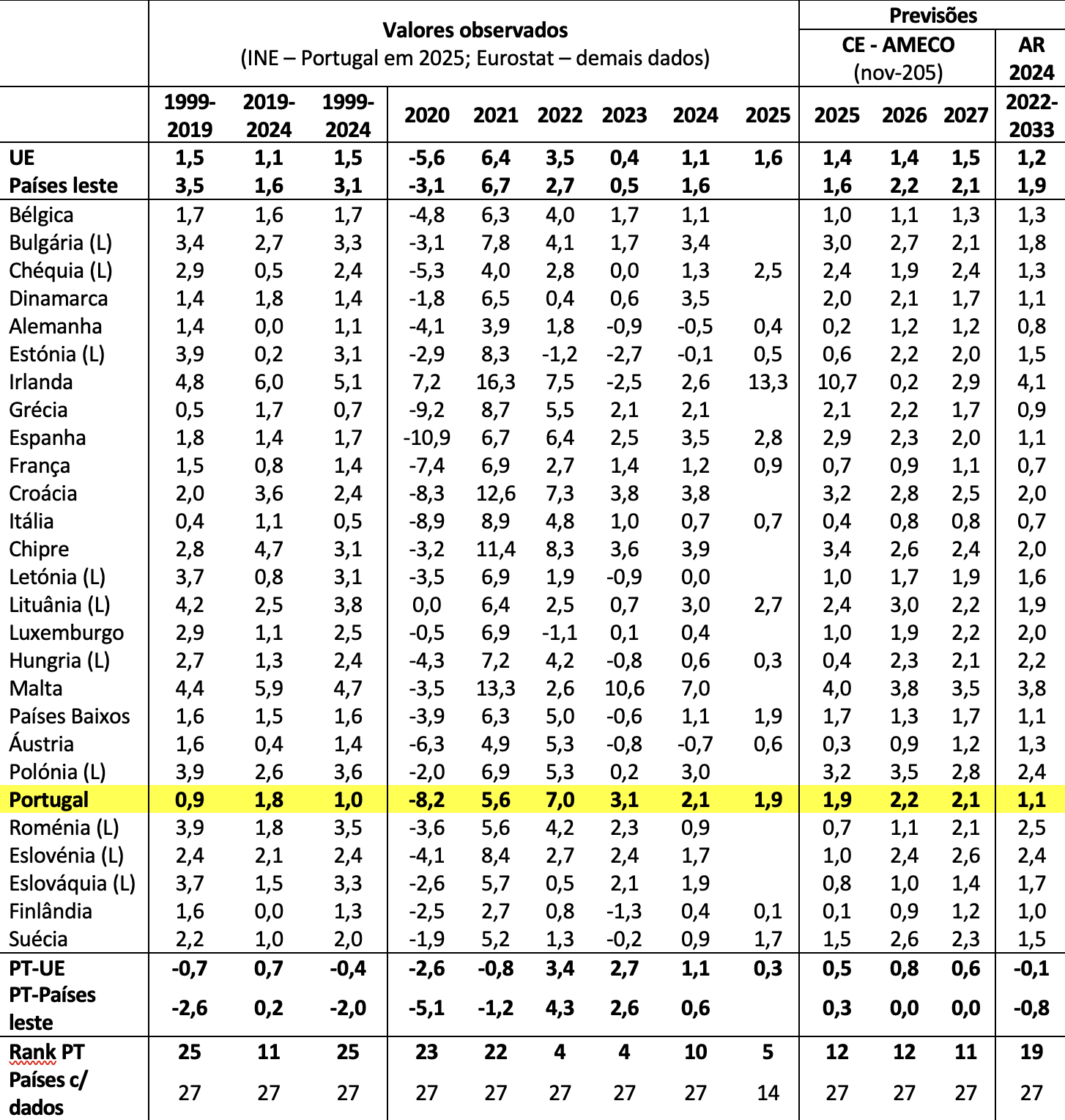 Fontes: INE, Eurostat e Comissão Europeia (CE) – European Economy nov-25; Ageing Report 2024 (AR 2024) –, conforme indicado na Tabela. Nota: o crescimento médio anual de 2022 a 2033 do AR 2024 é medido através do crescimento do PIB potencial, que em períodos longos como esse (que foi o usado no estudo da FEP referido no texto) – que esbatem os efeitos cíclicos –, tende a aproximar-se do crescimento do PIB efetivo, sendo estas as previsões a mais longo prazo disponível para as economias europeias. L = países de leste integrantes da UE (27): países bálticos (Estónia, Letónia, Lituânia), países da Europa central e oriental (Chéquia, Hungria, Polónia e Eslovénia); e países dos Balcãs (Croácia, Bulgária e Roménia). Os valores do agregado “países de leste” correspondem à média simples dos valores de crescimento desses países nos períodos em causa.