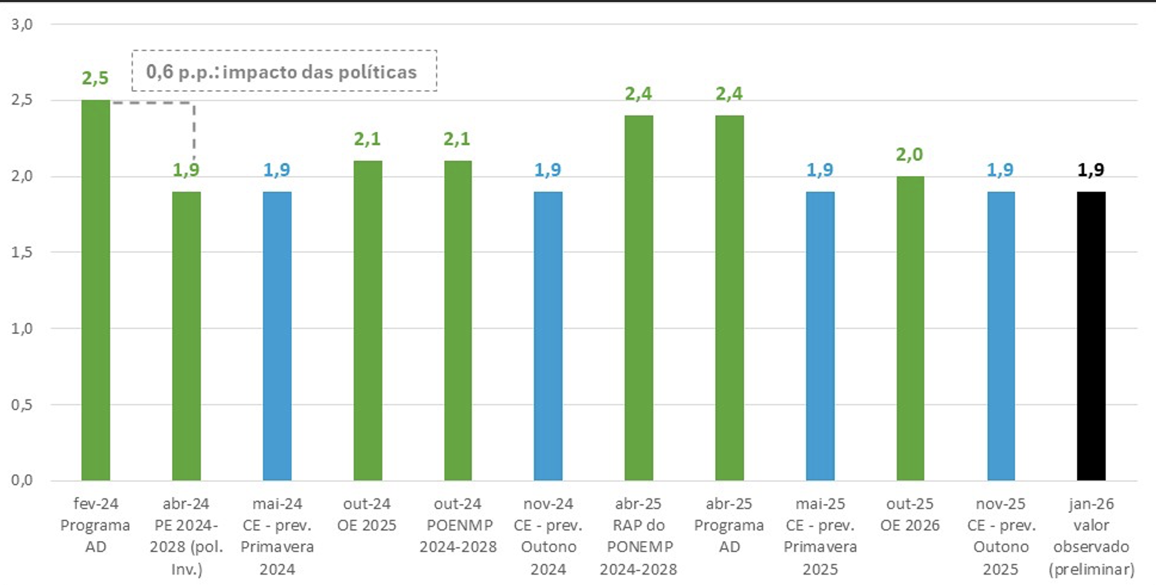 Fontes: AD (programas eleitorais de 2024 e 2025); Ministério das Finanças (Programa de Estabilidade, PE, 2024-2028; Plano Orçamental-Estrutural Nacional de Médio Prazo – POENMP 2024-2028; Relatório Anual de Progresso – RAP do POENMP; Orçamento de Estado de 2025 e 2026, OE 25 e 26), INE (valor observado preliminar, divulgado em jan-26) e Comissão Europeia (previsões da publicação European Economy de mai-24, nov-24, mai-25 e nov-25), CE. Notas: p.p. = pontos percentuais. Para facilitar a inspeção visual do gráfico, as projeções do governo são assinaladas a verde, as da CE a azul e o valor observado a preto; o impacto implícito das medidas de política na projeção da AD de fev-24, a cor cinza, é obtido por diferença face ao cenário de políticas invariantes do PE 2024-2028 divulgado pouco depois.