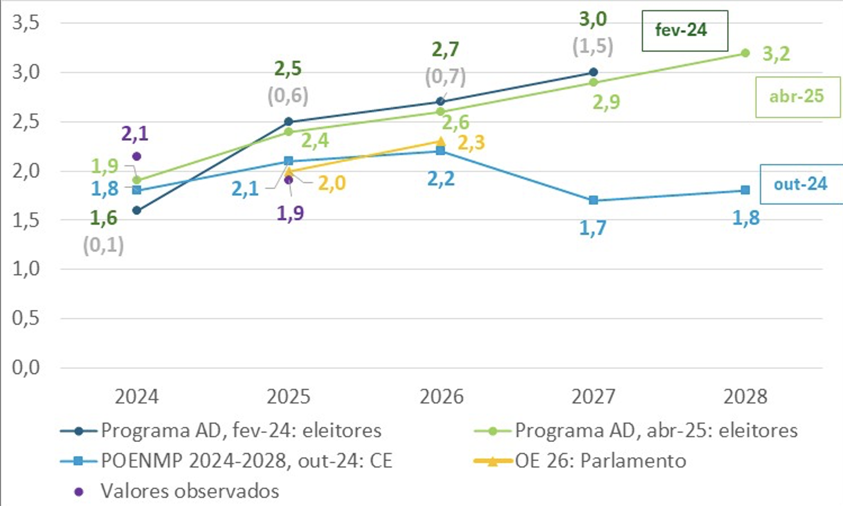 A Figura 2 permite perceber que esse valor observado ficou significativamente abaixo do prometido por esta AD nos programas eleitorais de 2024 (2,5%, em fev-24) e 2025 (2,4%, em abr-25).