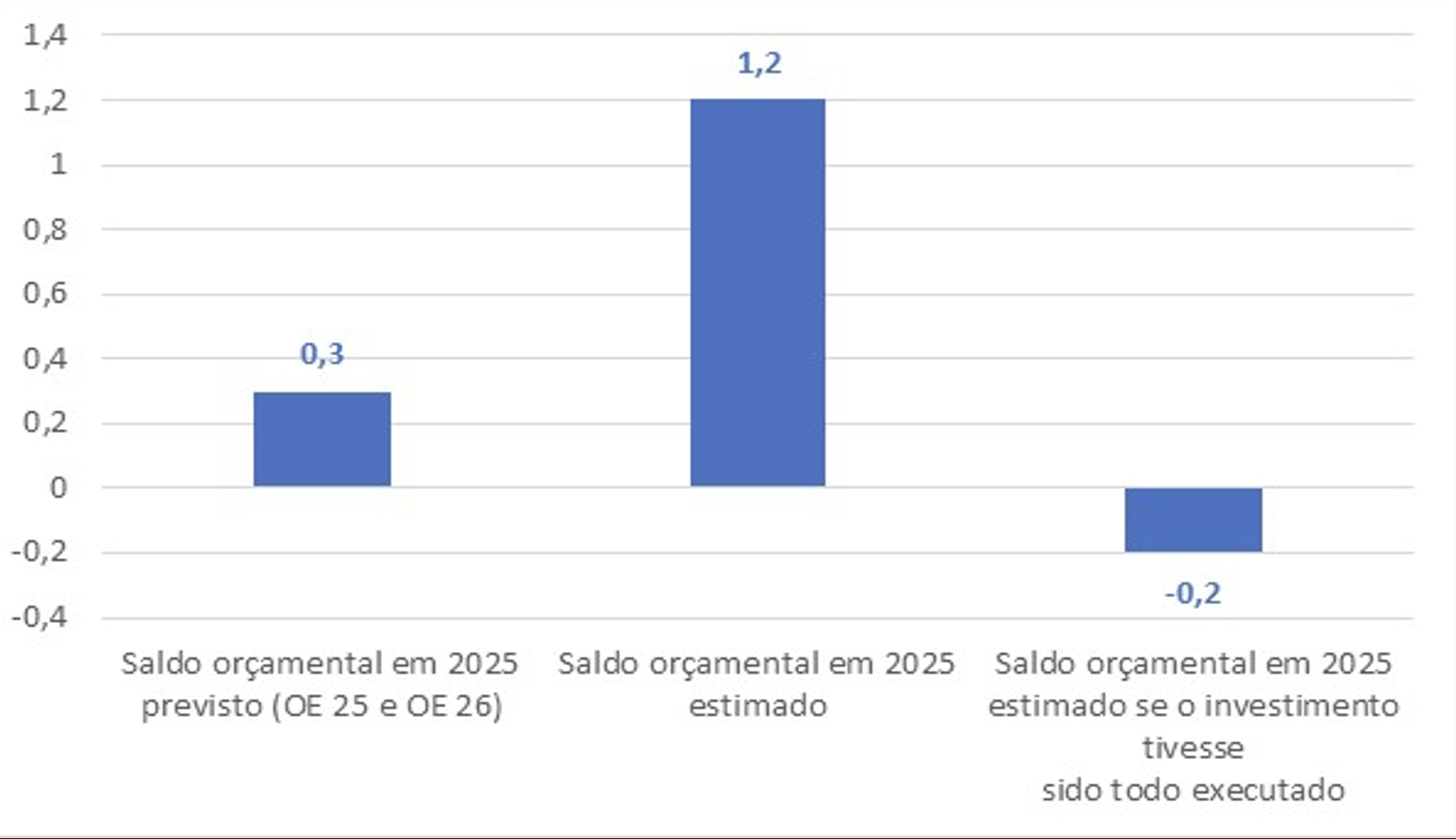 O saldo estimado (grosseiramente) de 1,2% do PIB é relevante porque, mesmo nesse cenário maximalista, a execução de todo o investimento inicial implicaria um défice de 0,2%, seguindo a mesma lógica de cálculo (as contas são apresentadas em detalhe na Tabela 2), dada a magnitude do desvio observado na despesa de capital (4,4 mil milhões de euros a menos nos dados em contabilidade e pública da síntese de execução na entidade orçamental). Se o valor final do excedente for inferior a 1,2%, como é plausível, então tal implicaria um défice ainda maior que 0,2% nesse cenário de execução a 100% do investimento.