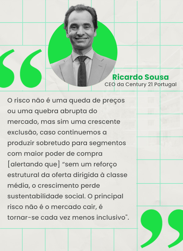 “O risco não é uma queda de preços ou uma quebra abrupta do mercado, mas sim uma crescente exclusão, caso continuemos a produzir sobretudo para segmentos com maior poder de compra” refere Ricardo Sousa da Century 21, alertando ainda que “sem um reforço estrutural da oferta dirigida à classe média, o crescimento perde sustentabilidade social. O principal risco não é o mercado cair, é tornar-se cada vez menos inclusivo”.