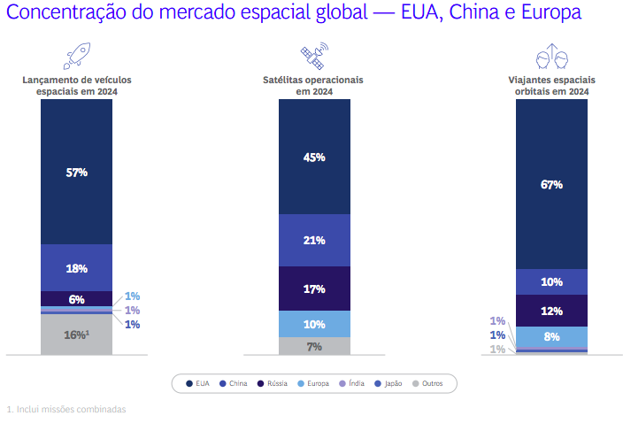 Estados Unidos, China e Europa são as regiões que concentram a atividade espacial. Em 2023, estavam em operação mais de 5.500 satélites a nível global, “com os EUA e a China a deterem a grande maioria dos ativos, lançamentos e do capital privado investido”.