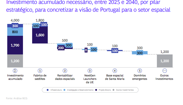 Um potencial que a BCG considera que pode ser alavancado através de um investimento de 4 mil milhões de euros, maioritariamente de origem institucional (80%), “mas acompanhado por um aumento de nove vezes no capital privado entre 2025 e 2040″ — estimava-se que em 2023 o investimento privado relacionado com o setor espacial fosse de apenas 10 milhões de euros — escalando as capacidades nacionais.