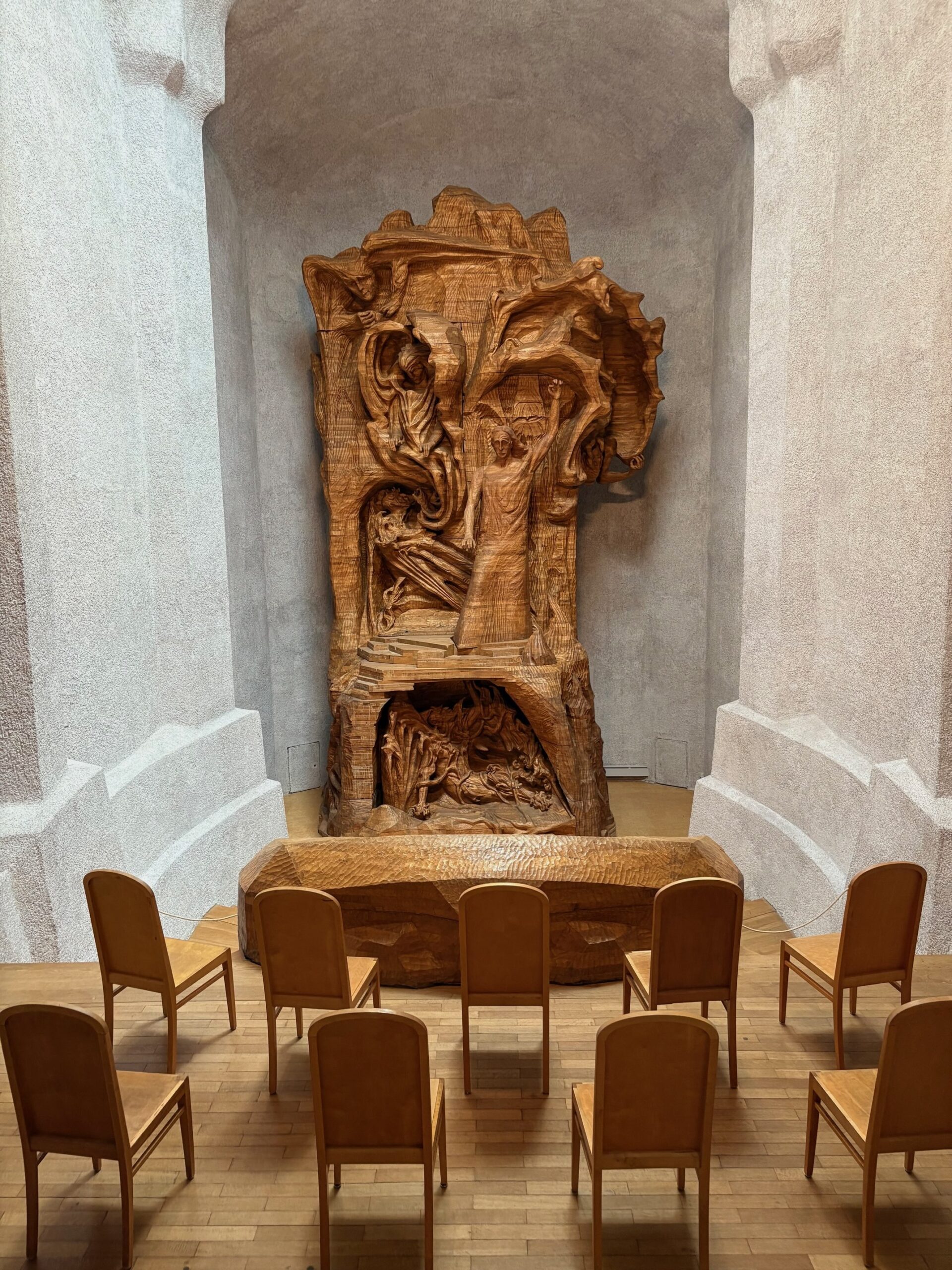 Numa sala, de acesso reservado, no último piso do edifício, reside aquela que, para mim, foi a descoberta mais extraordinária: um conjunto de cadeiras convida os visitantes à reflexão perante uma escultura imponente em madeira, com mais de nove metros de altura, em que uma figura, representando a Humanidade, se confronta com as forças do mal.